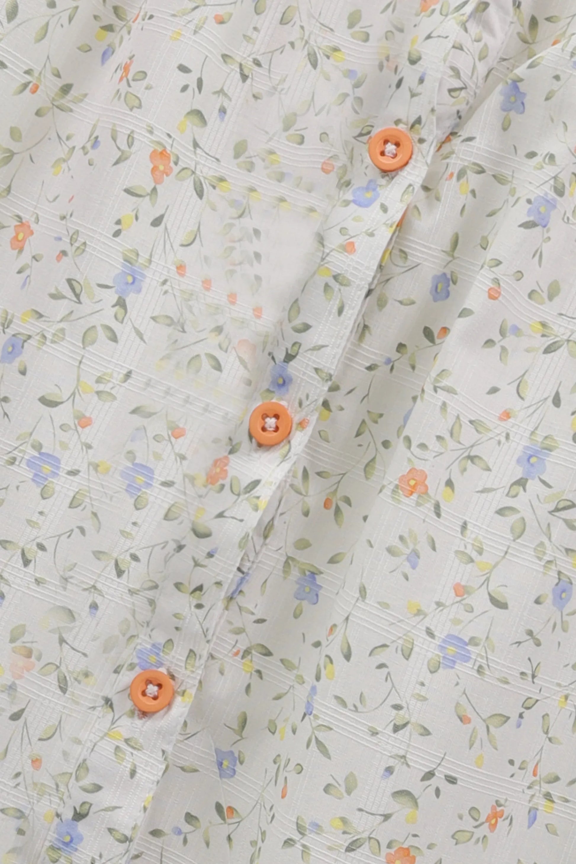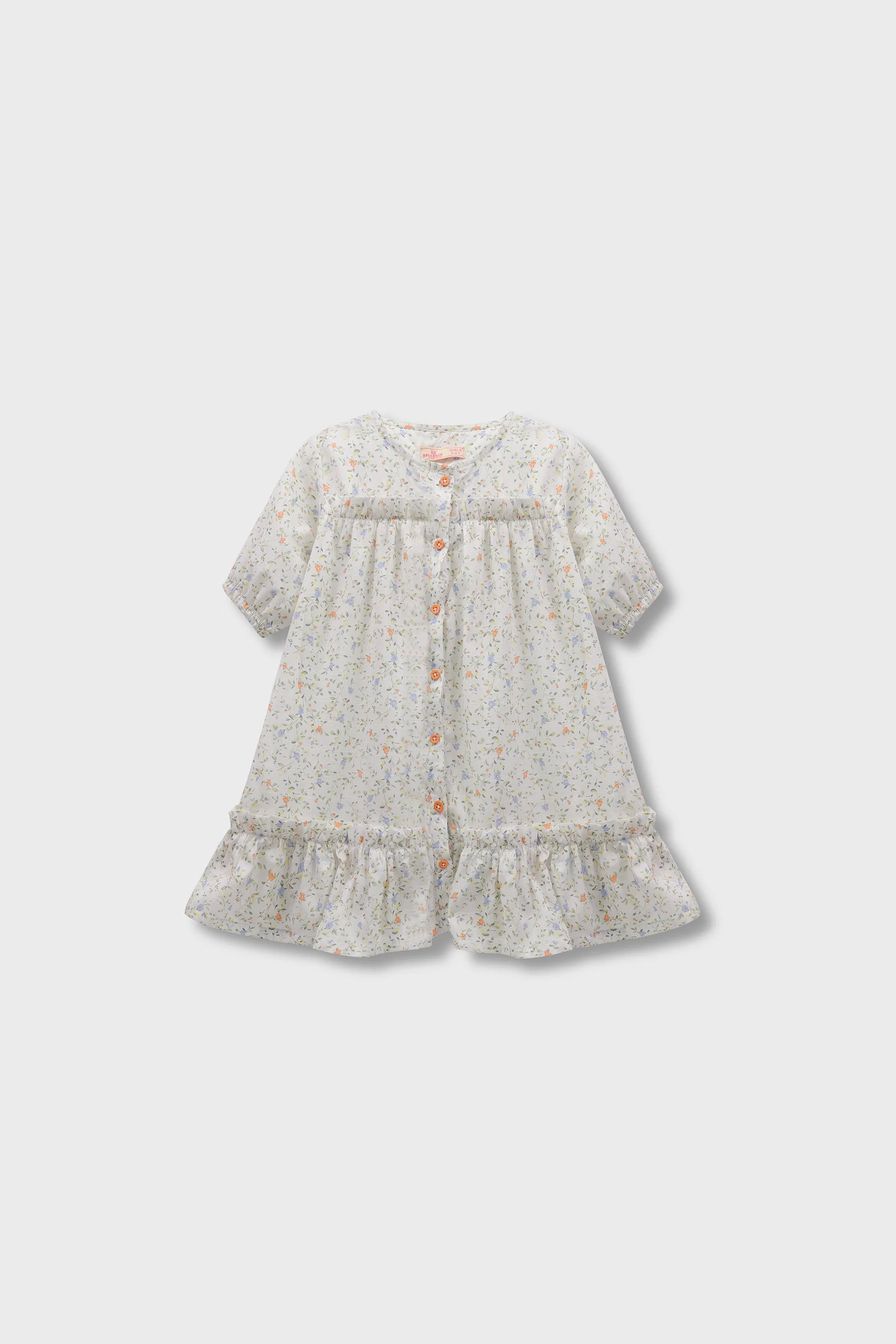 صُمم هذا الفستان الأبيض من القطن الفاخر، ويتميز بطبعة زهور رقيقة تضفي أناقة بلا عناء. يُضفي تصميم الأزرار الأمامية والأكمام المنتفخة والحافة السفلية المكشكشة قصةً جميلة ومرحة. خفيف الوزن وجيد التهوية، إنه قطعة لا غنى عن