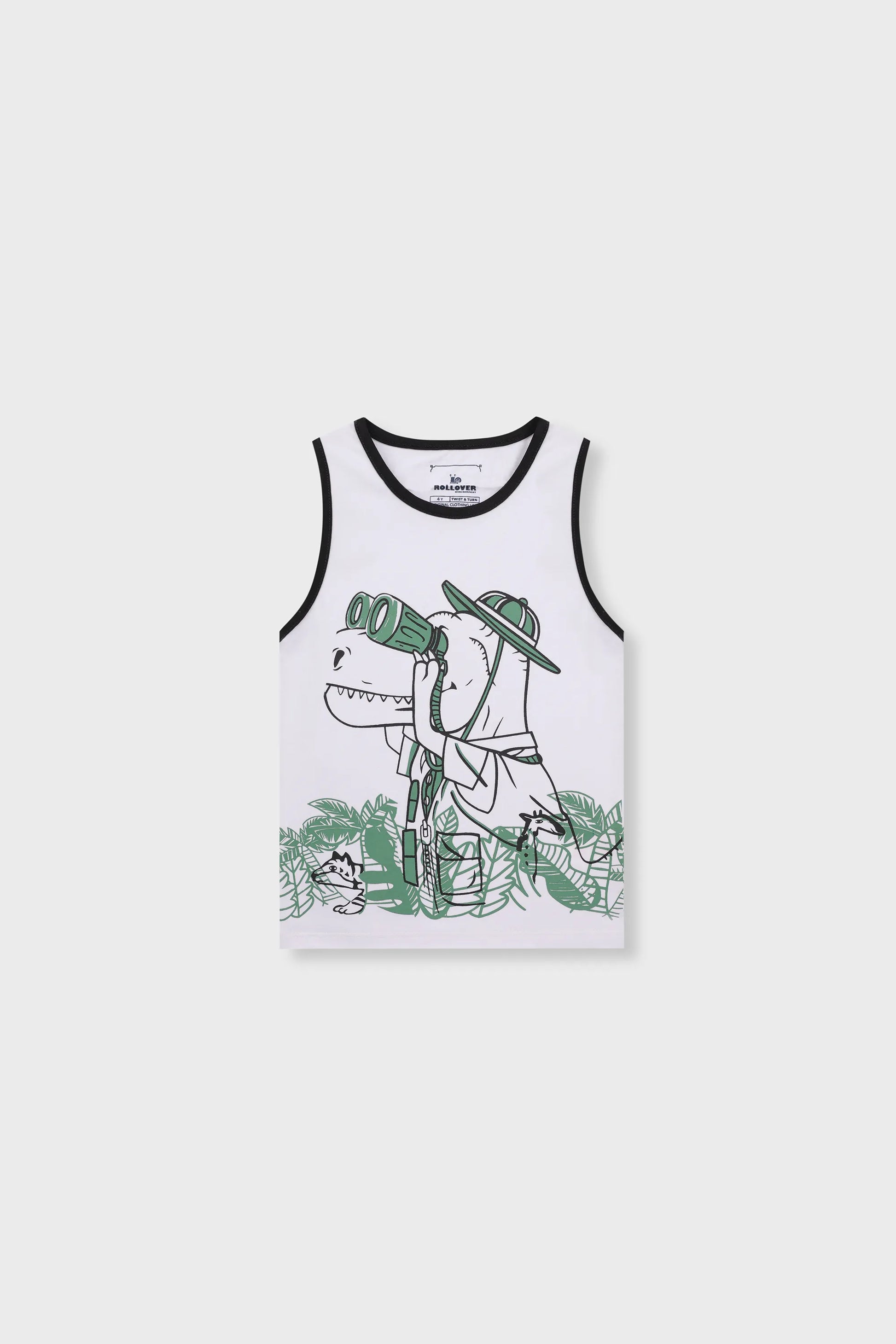 تأتي هذه السترة الصيفية بلا أكمام للأولاد بلون أبيض ناصع وتصميم قماشي خفيف لإطلالة منعشة. يظهر عليها رسم ممتع لديناصور فضولي في مهمة استكشاف، مع منظار وورق شجر استوائي. نسيجها الناعم وتصميمها الخفيف يجعلانها مثالية للحر