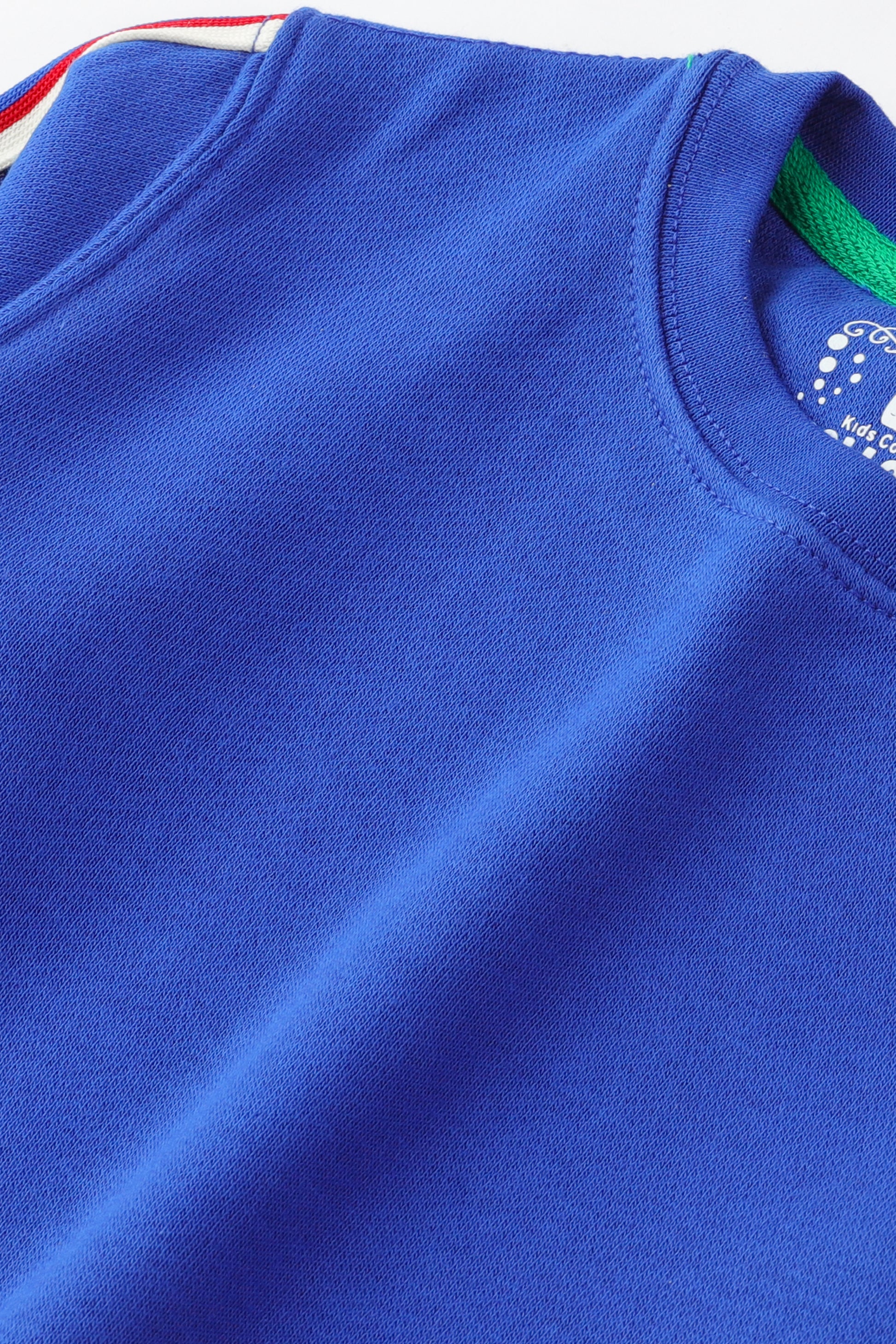 ارتقِ بخزانة ملابس طفلك الرسمية مع سويت شيرت الرويال بلو المقلم. هذه القطعة الأنيقة المصنوعة من الصوف عالي الجودة تتميز بياقة دائرية مع أساور وحافة مضلعة بلون مطابق، مما يوفر مظهرًا مصقولًا. العنصر البارز هو الشريط المطاطي ثلاثي الألوان الذي يمتد على طول الأكمام، مما يضيف لمسة من التميز ويوفر الراحة والأناقة مع لمسة من الرقي.