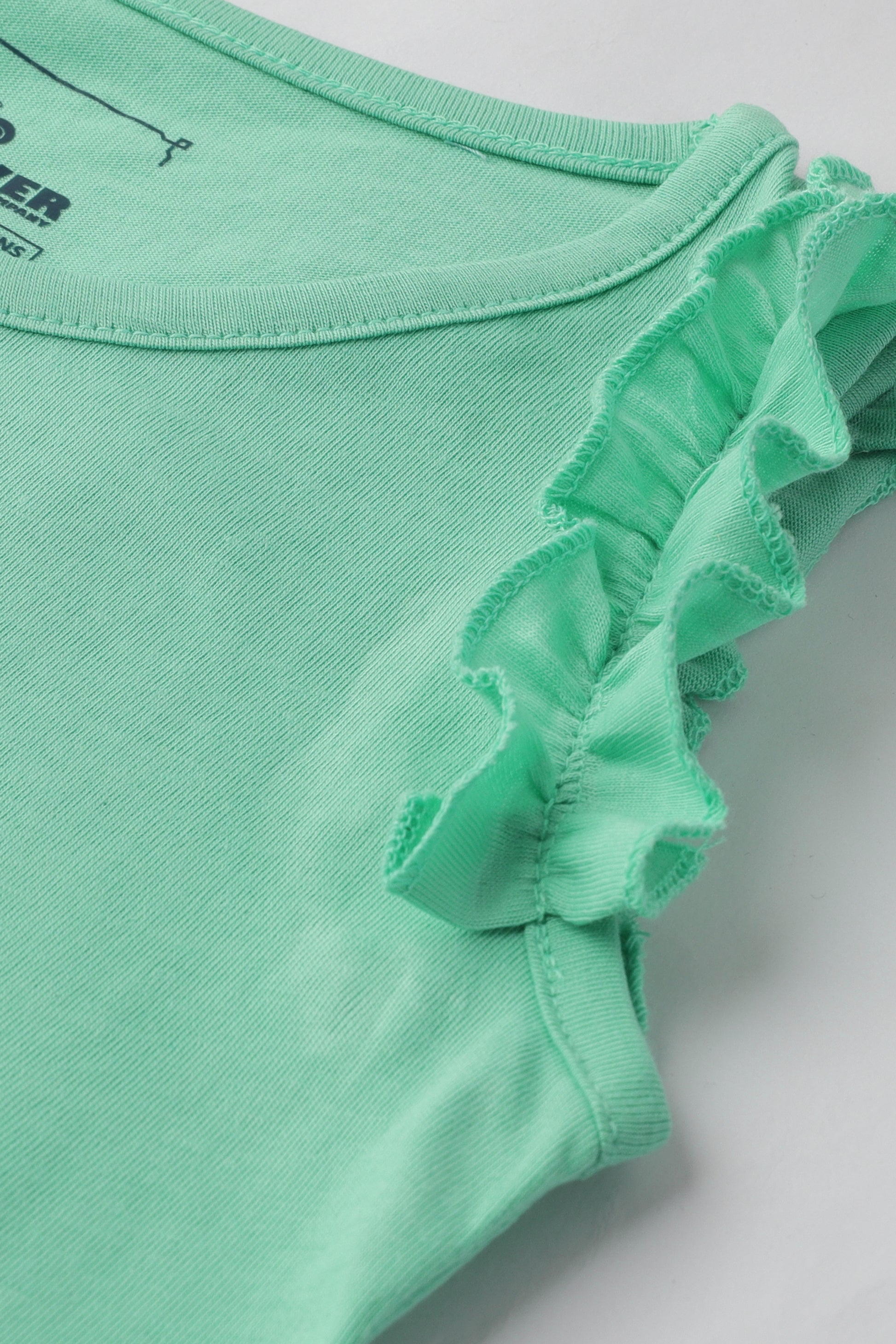 تيشيرت النعناع المرح بكشكشة هو إضافة رائعة لخزانة ملابسها الكاجوال. صُمم من قماش جيرسي ناعم، ويتميز بتفاصيل كشكشة على الكتفين ودرجة لون النعناع الساحرة. إنه خفيف الوزن، مسامي، وأنيق دون عناء - مثالي ليوم مليء بالمرح والضحك!