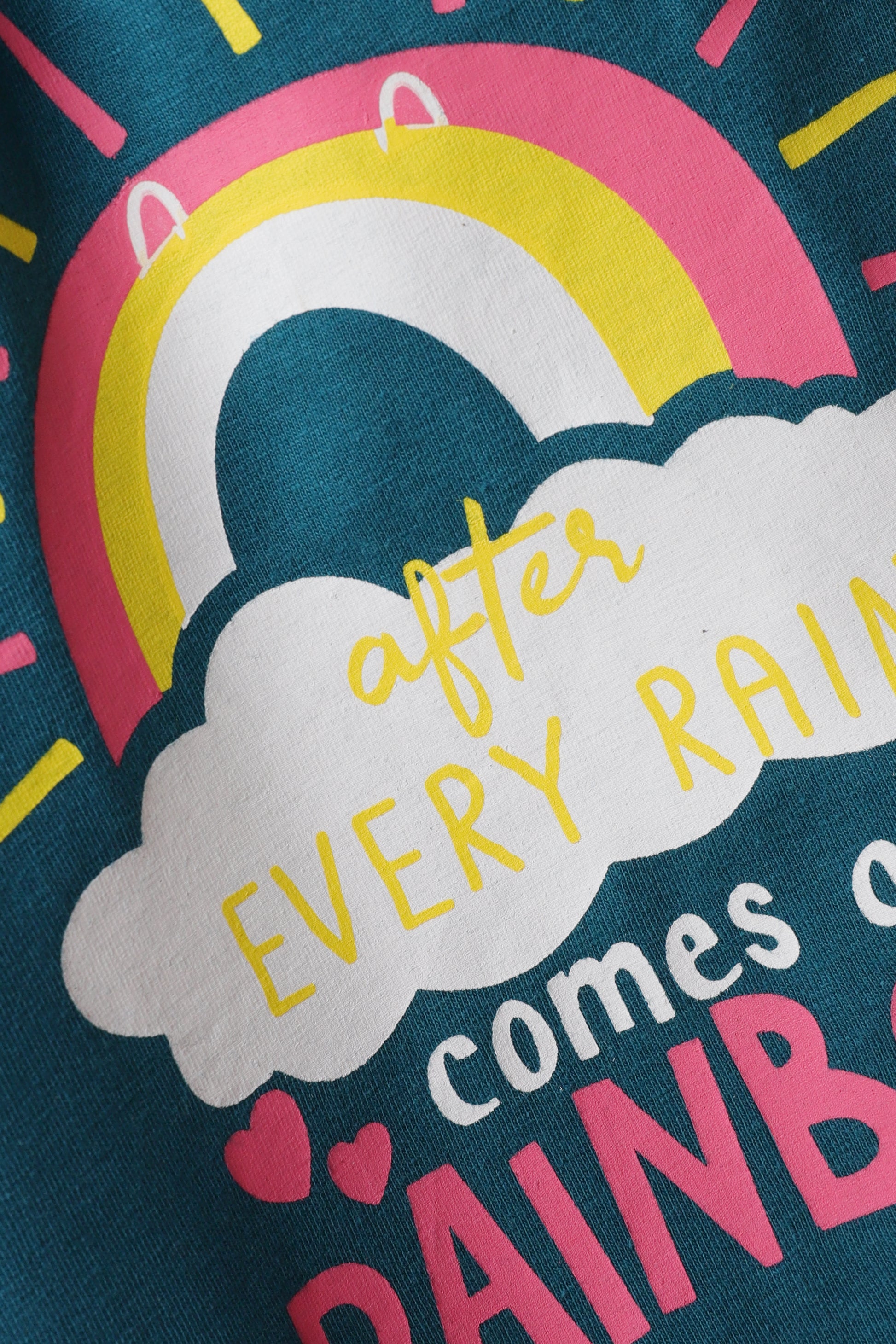 تتميز هذه التيشيرت ذات اللون الأزرق المخضر للفتيات بطباعة مبهجة مع قوس قزح وأشعة الشمس والغيوم وعبارة "بعد كل مطر يأتي قوس قزح". تتميز بأربطة كتف معقودة وقصة بدون أكمام، ويوفر القماش الناعم راحة طوال اليوم. مثالية للرحلات المشمسة والأيام المرحة.