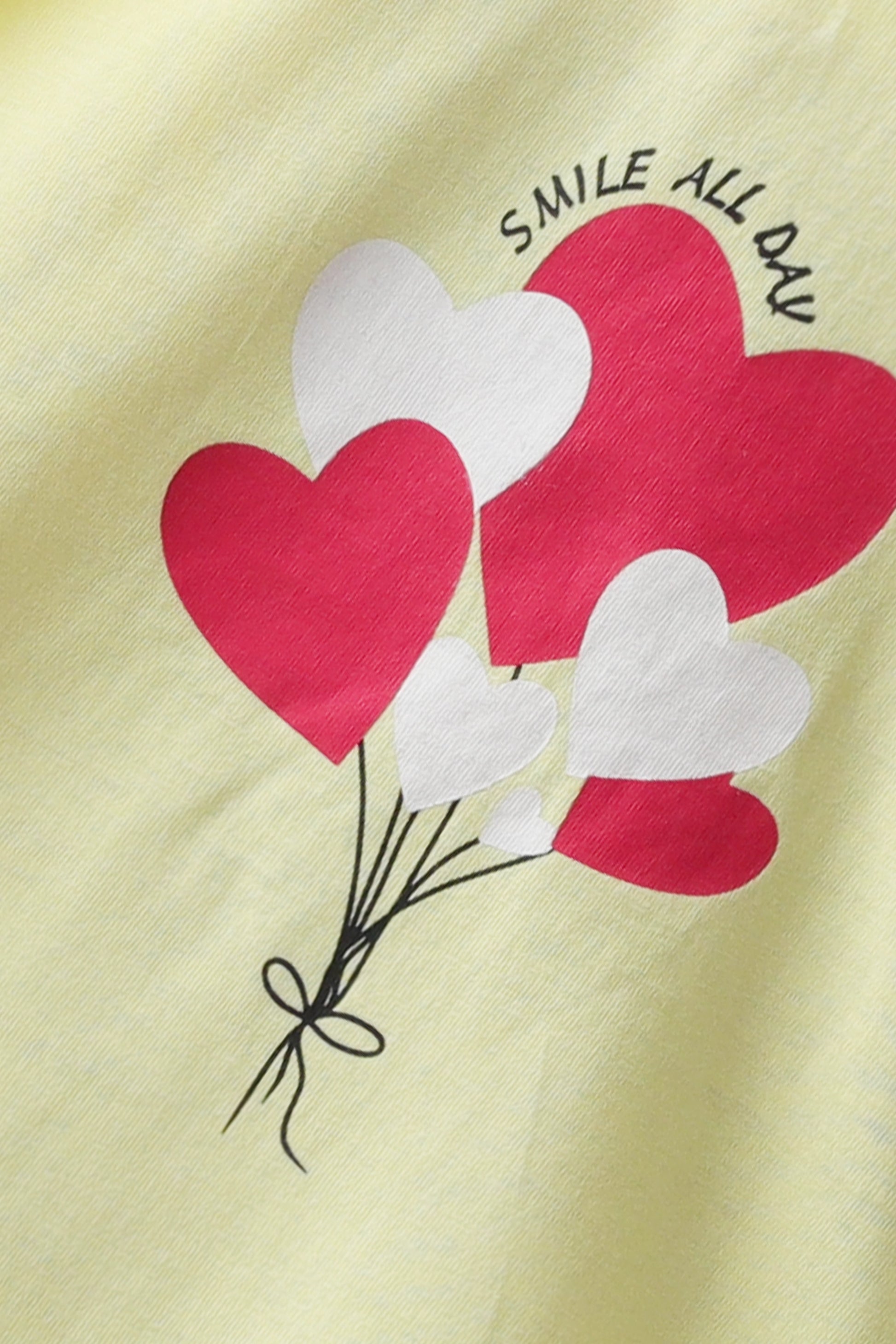 يتميز هذا التي شيرت باللون الأصفر الفاتح المصنوع من قماش الجيرسيه الثقيل والناعم بطبعة بالون قلب مبهجة مع عبارة "Shine All Day". الأكمام الطويلة والفتحات الجانبية المنحنية تضيف الراحة والأناقة. مثالي للصباحات المشرقة وبعد الظهر المفعمة بالمرح، فهو يمزج بين الدفء المريح والأسلوب اللطيف والراقي.
