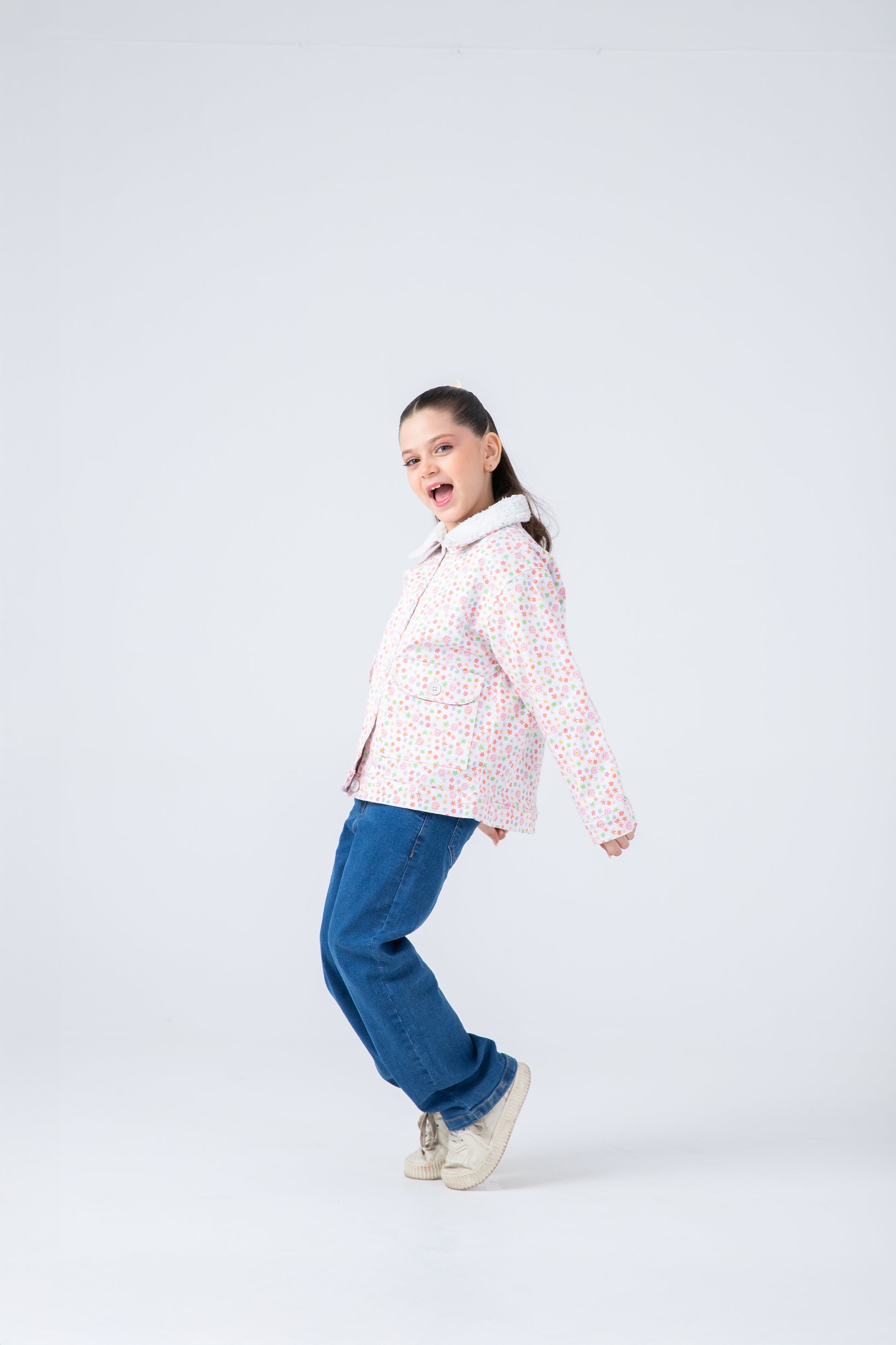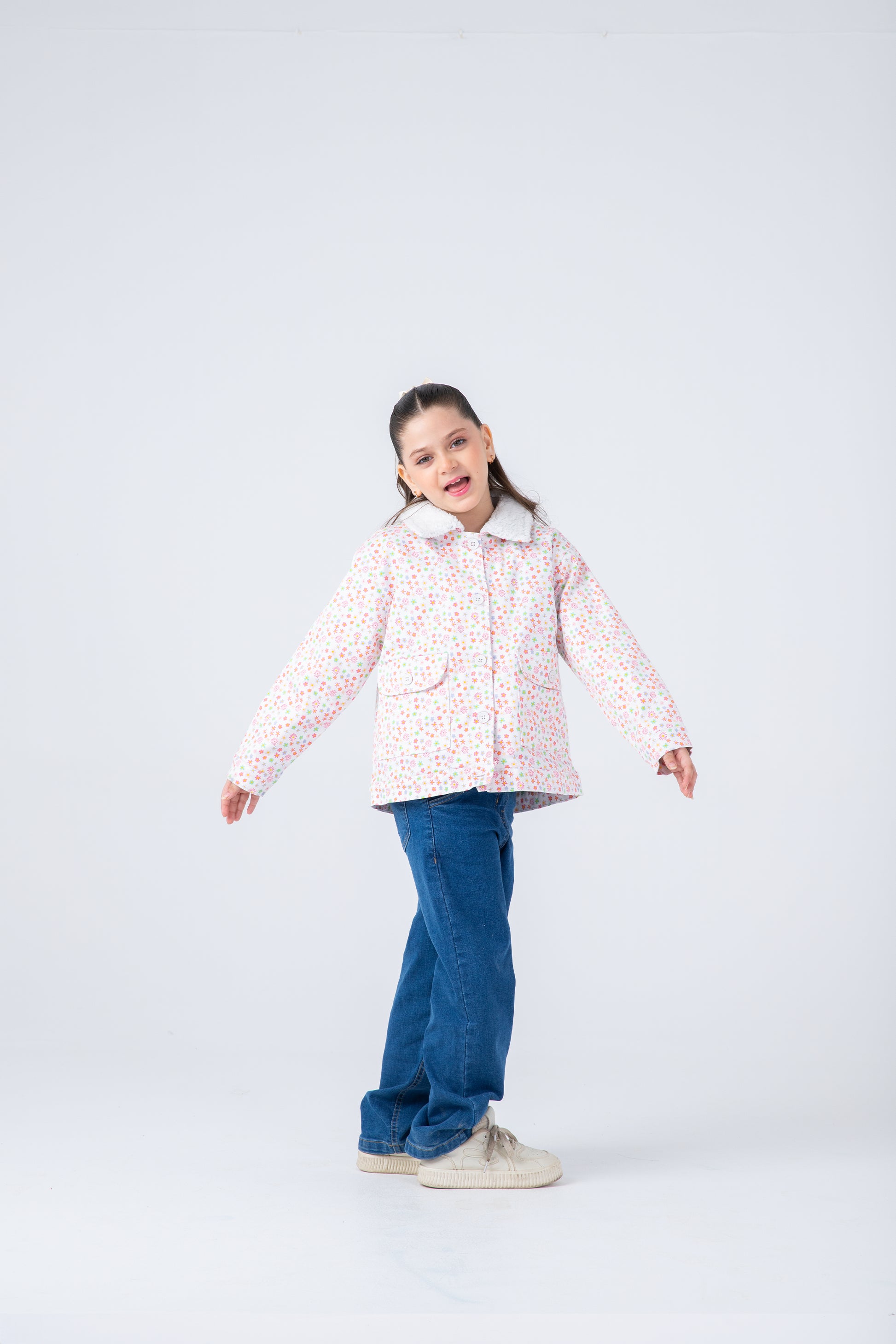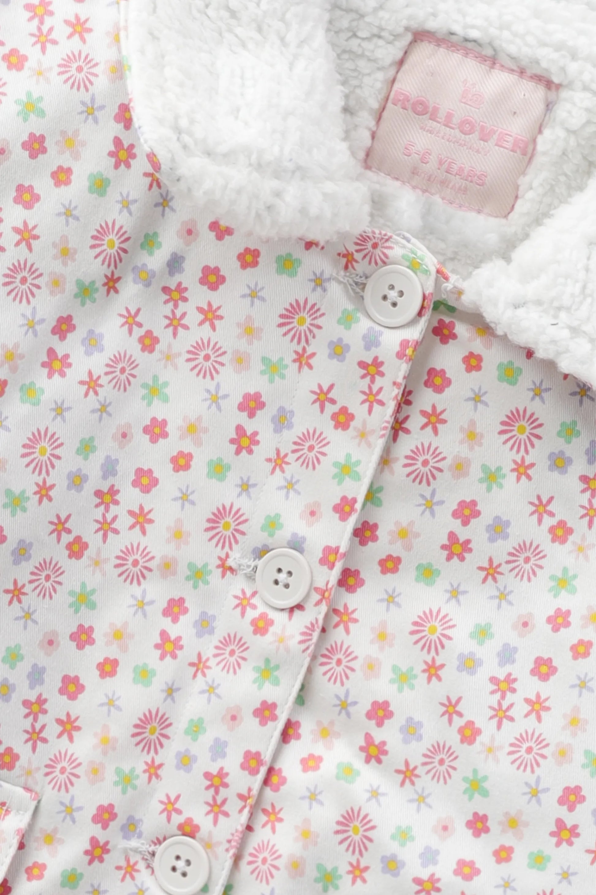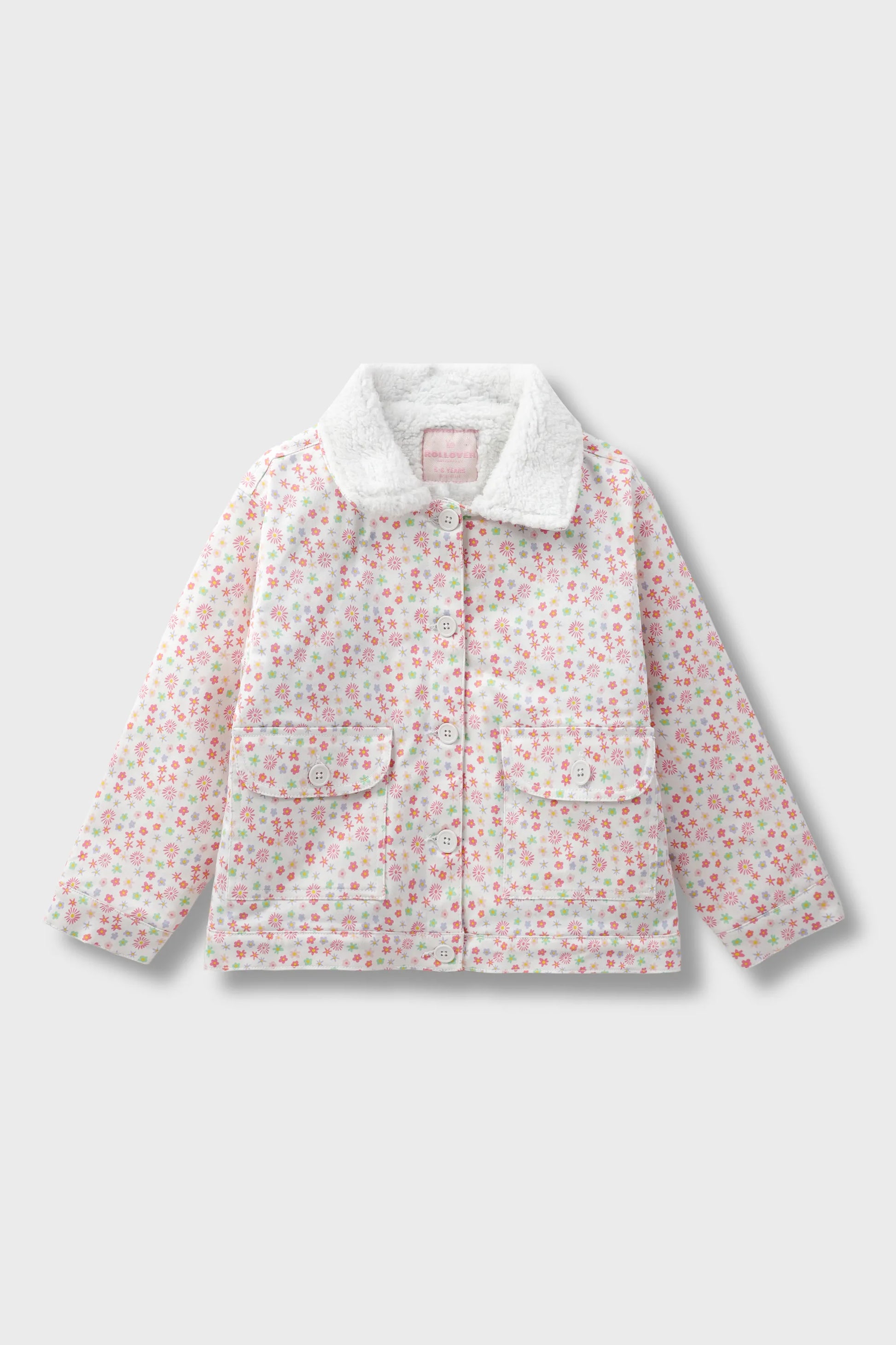 أغدقي عليها الدفء مع هذه السترة من نسيج التويل المبطنة بالزهور، والمبطنة بشيربا ناعمة. تتفتح القاعدة البيضاء المبهجة بالورود الملونة، بينما توفر البطانة الداخلية راحة دافئة للأيام الباردة. صُممت بجيوب بغطاء وأزرار إغلاق، وتجمع بين المرح والعملية لرحلات الشتاء اليومية.