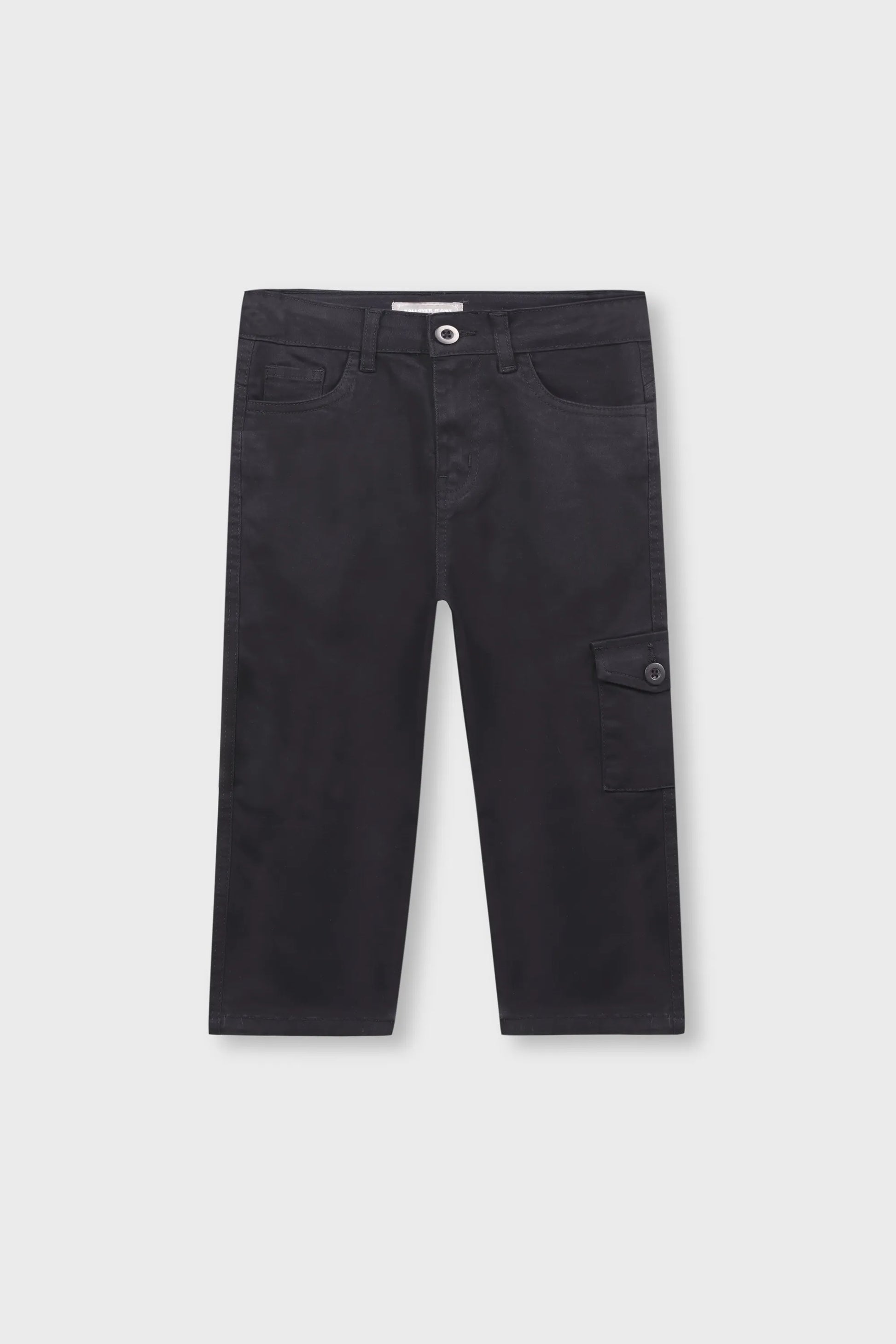صُممت هذه السراويل الكارجو السوداء من قماش التويل وتأتي مع جيوب واسعة على الركبتين، مما يجعلها مثالية للمغامرين الصغار الذين يحبون الاحتفاظ بأغراضهم الأساسية في متناول اليد. تتميز هذه السراويل بقصة مستقيمة ودرزات مزدوجة، مما يوفر الأناقة والمتانة