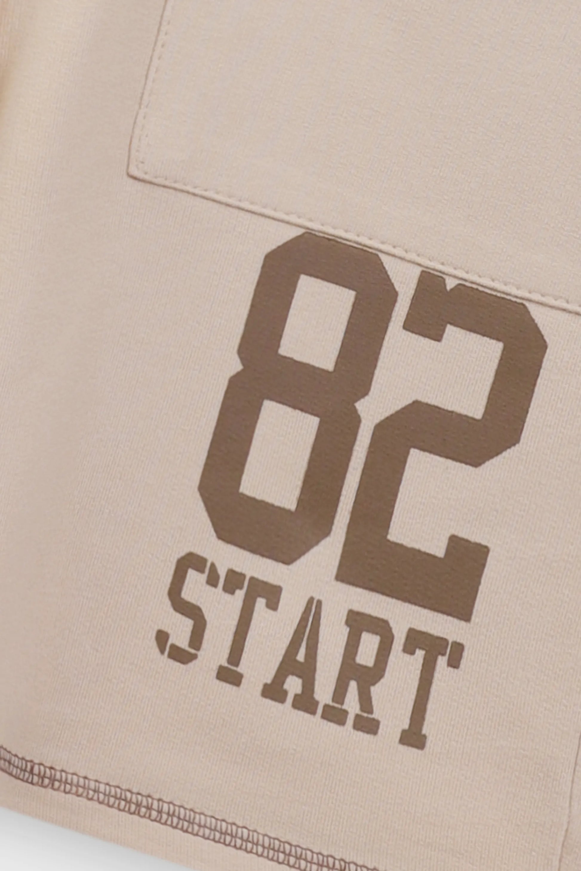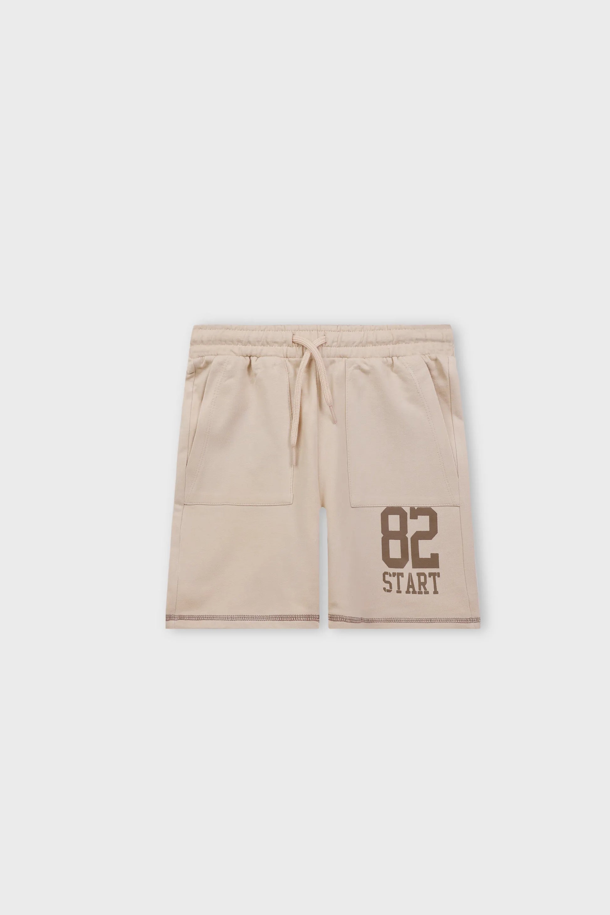 مثالي للأولاد النشيطين، هذا الشورت البيج من قماش تيري الفرنسي مزين بطبعة "82 START" جريئة على الجيب الخلفي. مع حزام خصر مطاطي مريح وتصميم يصل للركبة، هذا الشورت مثالي للعب في الهواء الطلق أو للنزهات الكاجوال. القماش المتين يضمن