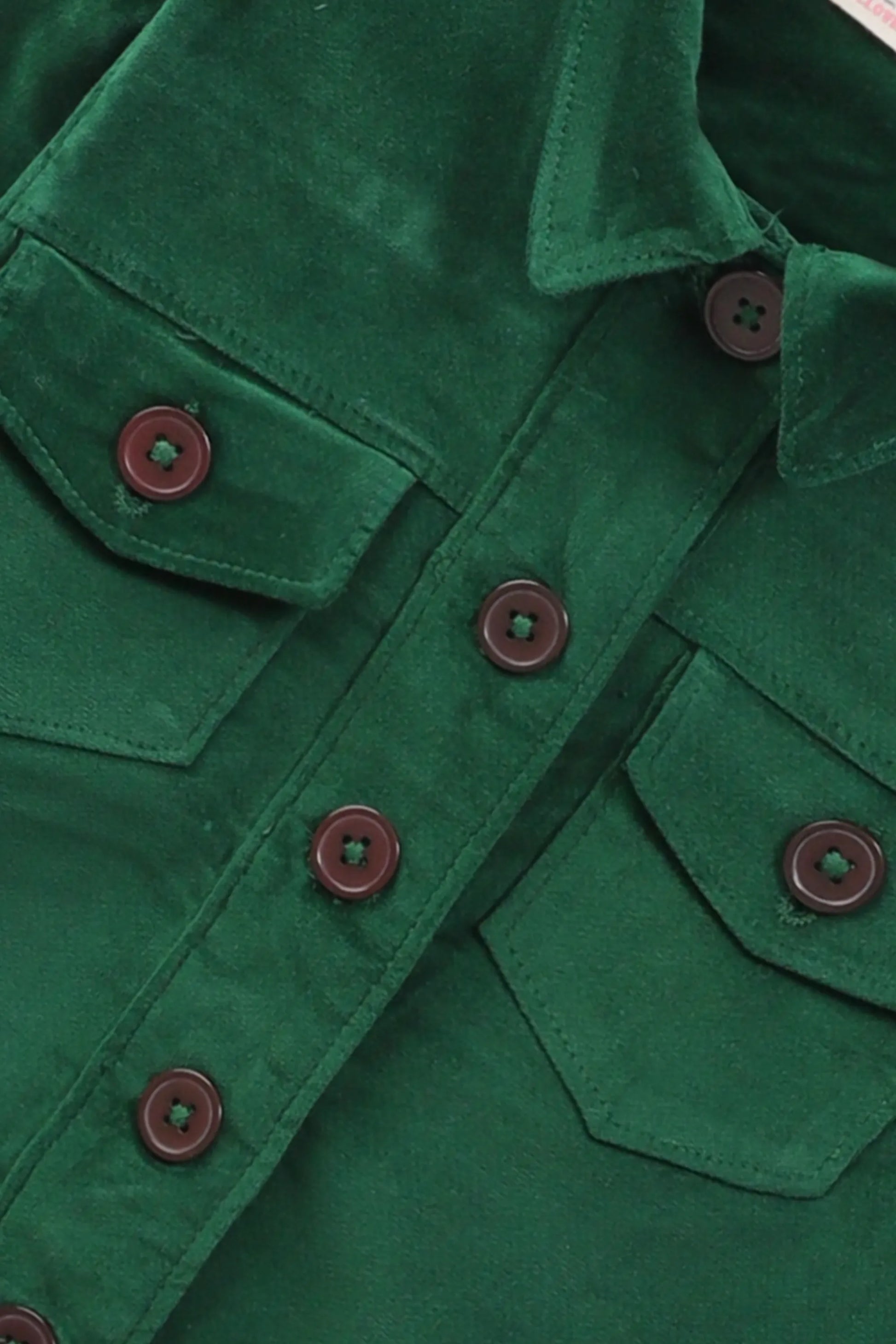 Designed for style and comfort, the Girls Corduroy Jacket is made from a soft green corduroy fabric. It features a smart collar, front button closure, and cuffed sleeves, giving it a refined, yet relaxed feel. With two flapped chest pockets for added detail, it’s both practical and fashionable, making it the perfect for cool days and stylish outings.