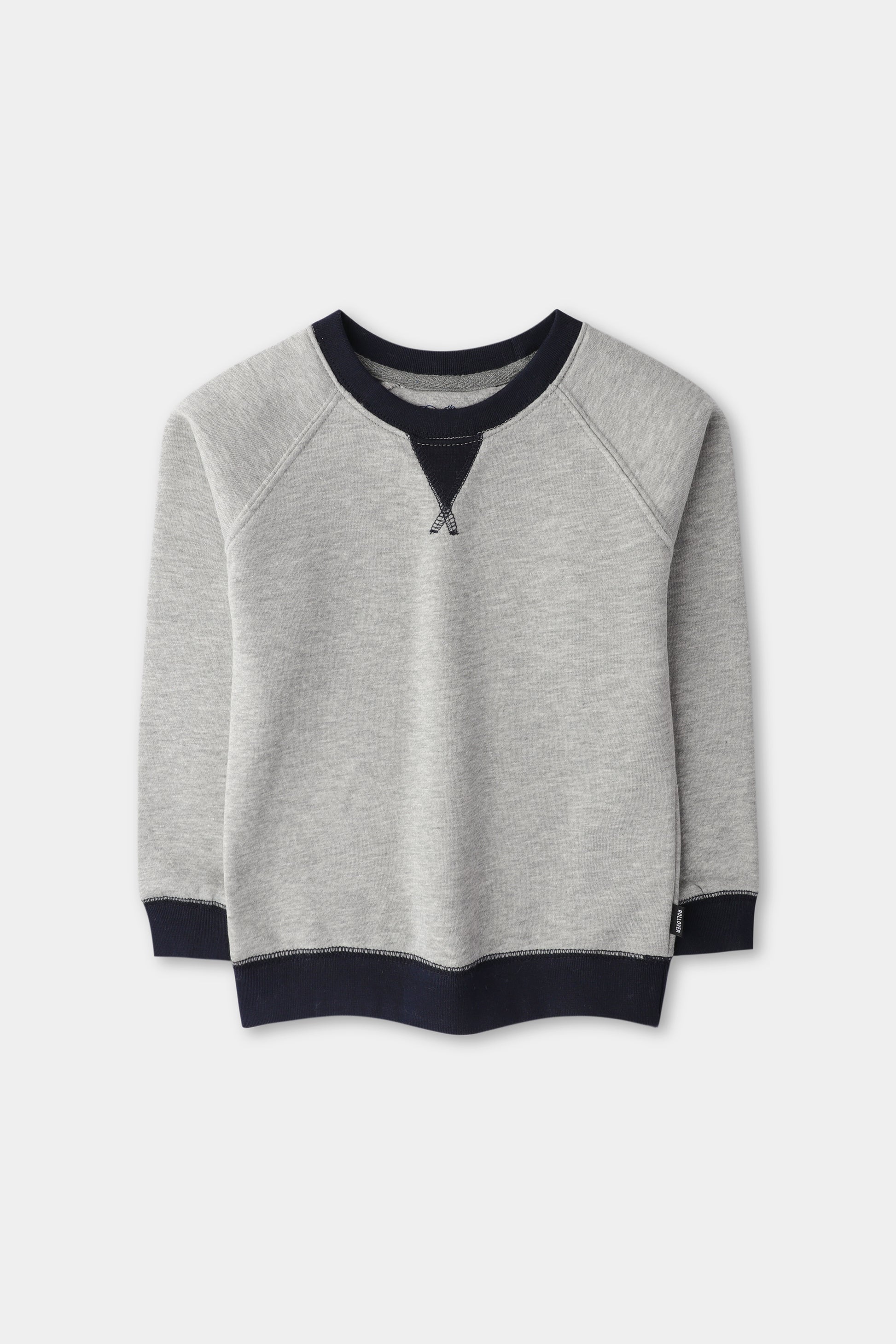Designed for the modern boy, this grey fleece sweatshirt is both comfortable and stylish. Featuring raglan sleeves for ease of movement, ribbed cuffs and hem for a secure fit, and a striking navy V-insert at the neck, it adds a contemporary touch to a classic style. Whether for play or lounging, this sweatshirt offers the perfect balance of casual style and warmth.