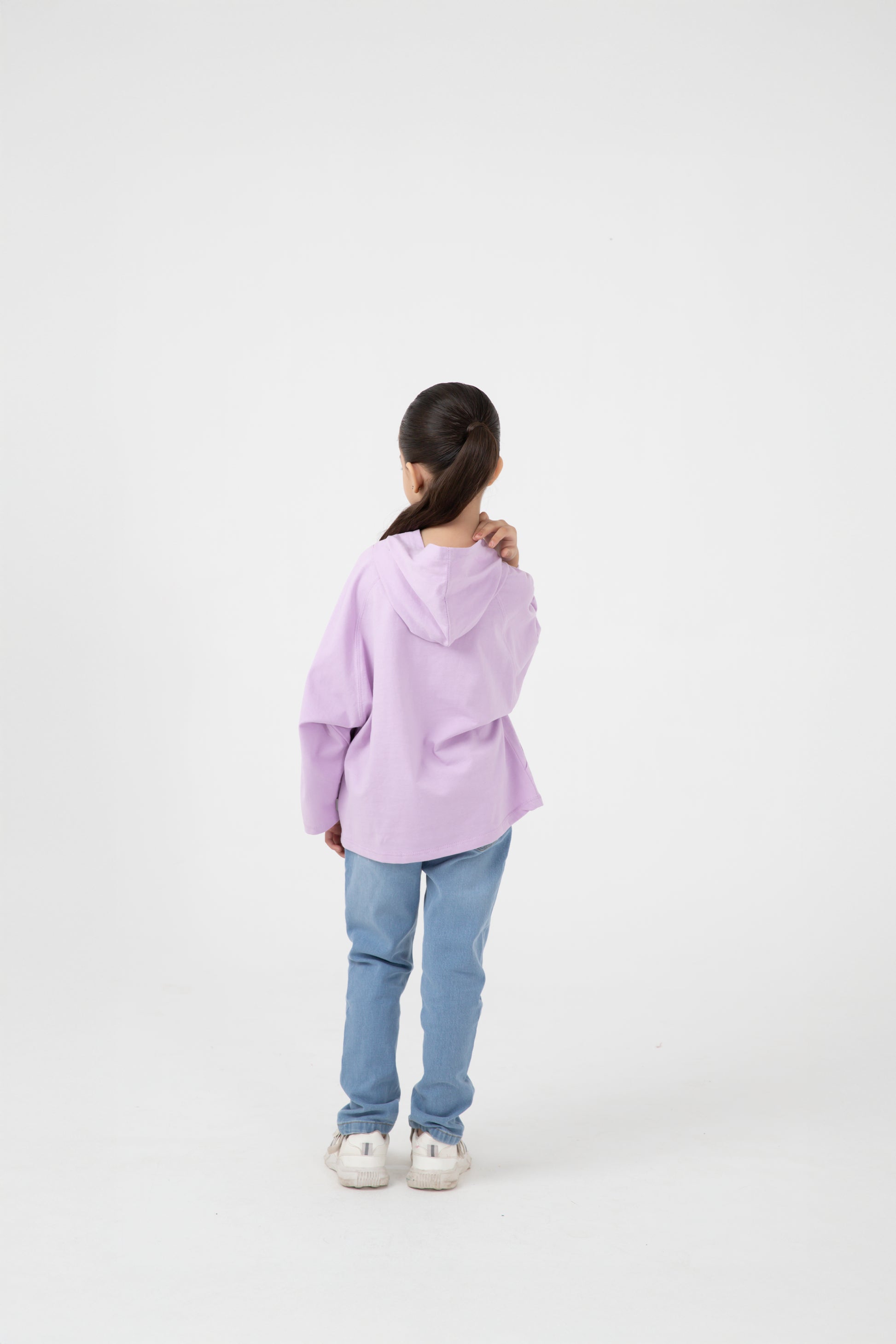 A lilac hooded tee made from soft heavy jersey, designed with a relaxed drop shoulder silhouette. Adorned with charming white daisy prints on the chest and right sleeve, it features a cozy front kangaroo pocket. Perfect for playful days and cool evenings with floral flair and effortless comfort.