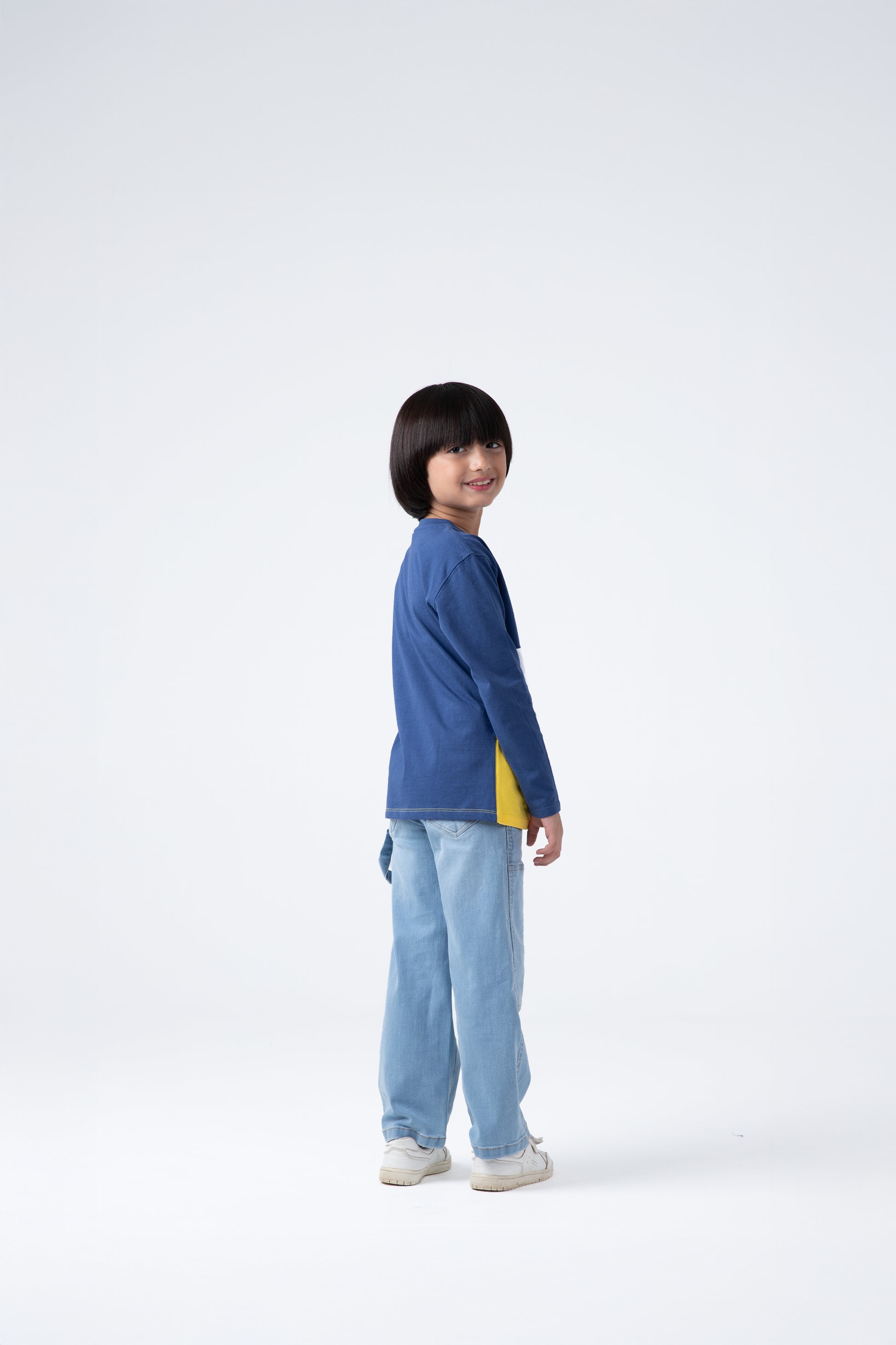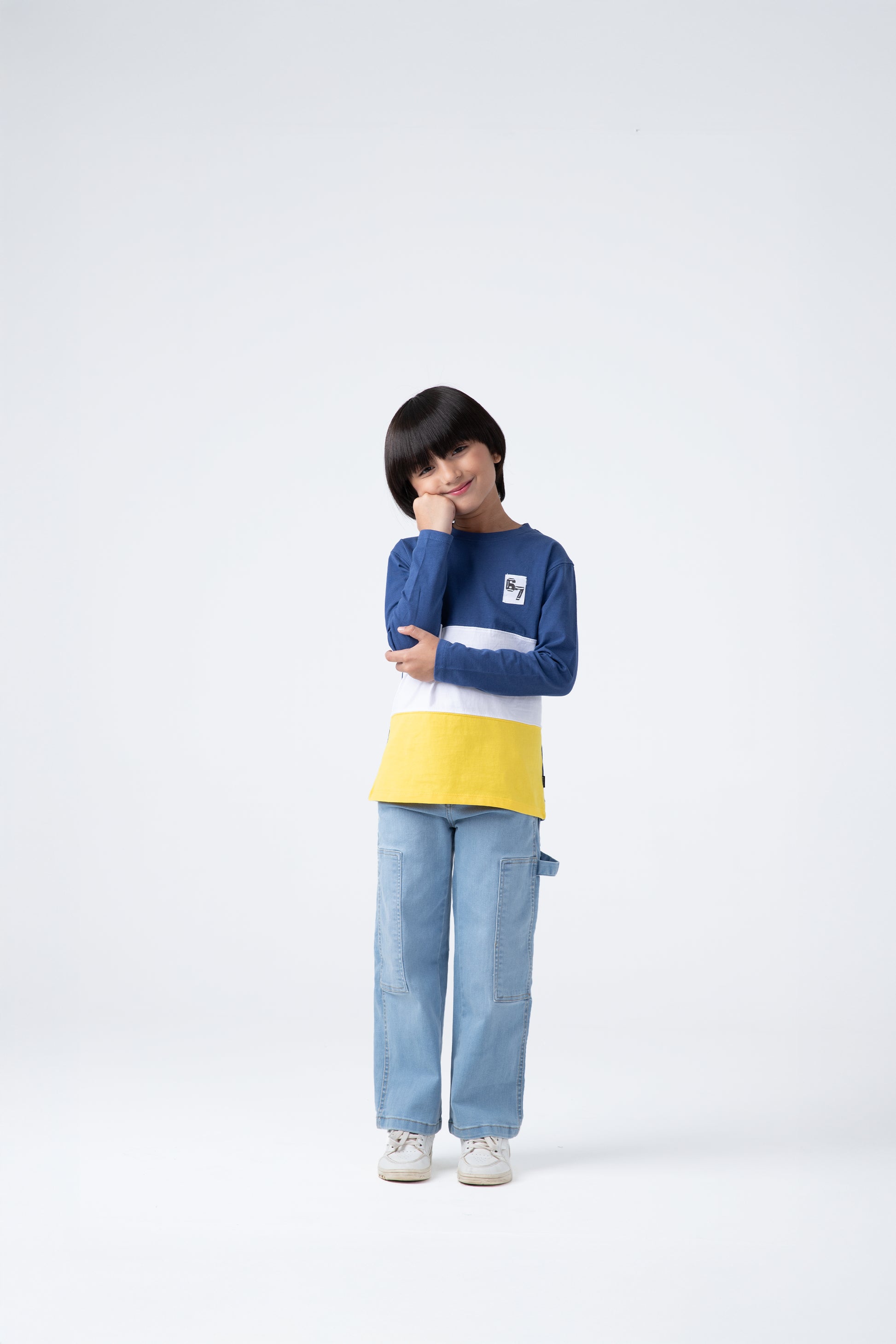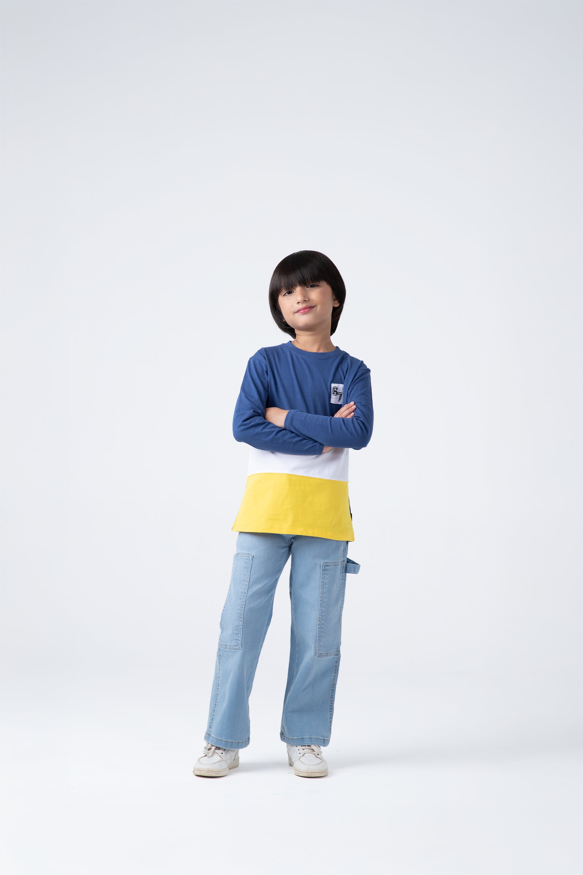 This bold color-block t-shirt fuses royal blue, white, and yellow in a sporty combo. Made with premium heavy jersey, it offers a structured feel and long-lasting comfort. A chest badge adds a pop of cool, making it a fun pick for energetic boys with a love for standout style.