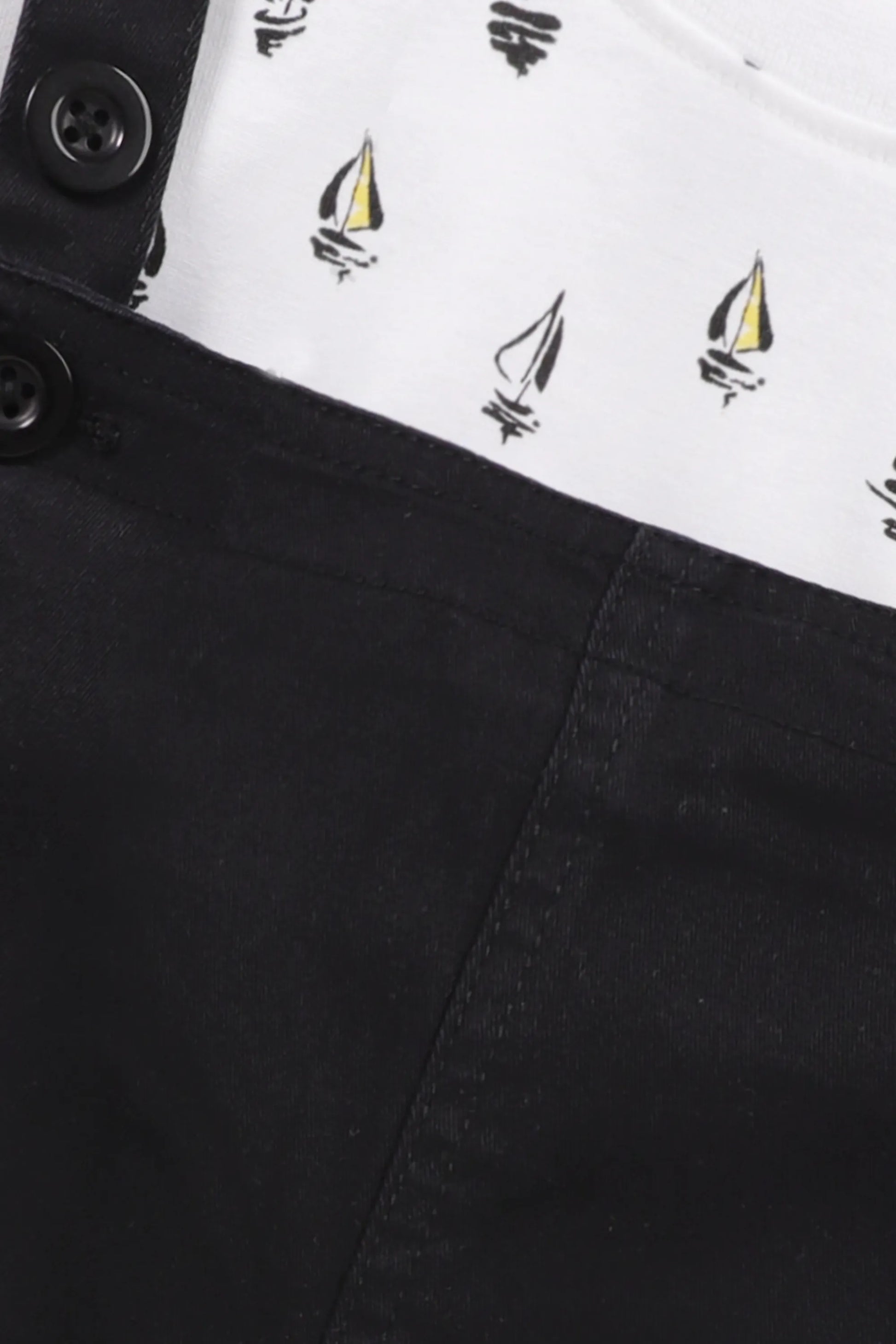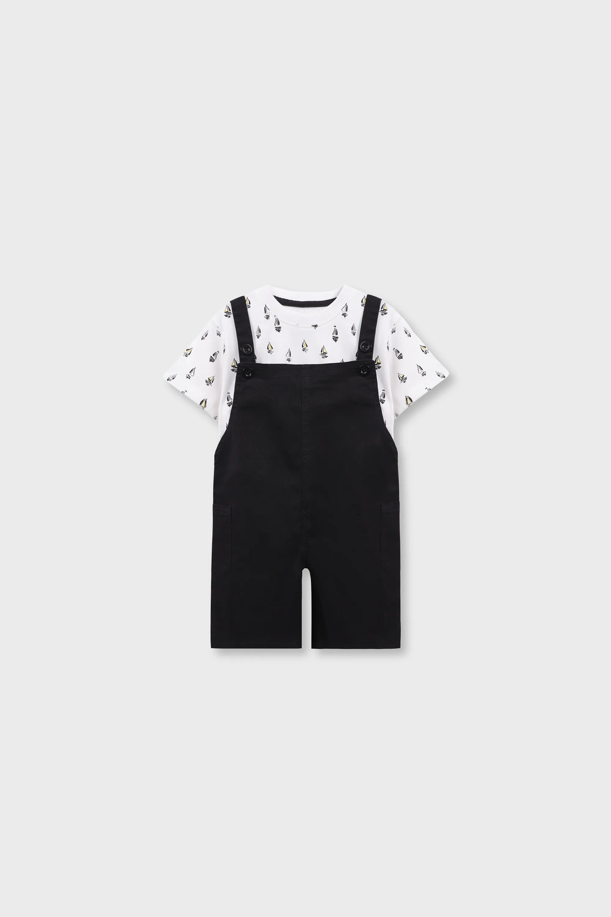 Ready for a day on the high seas (or just a fun adventure)? This dungaree set features a soft white jersey t-shirt with sailboat prints and durable black twill dungarees. Perfect for casual days, it offers style and comfort with adjustable straps for a