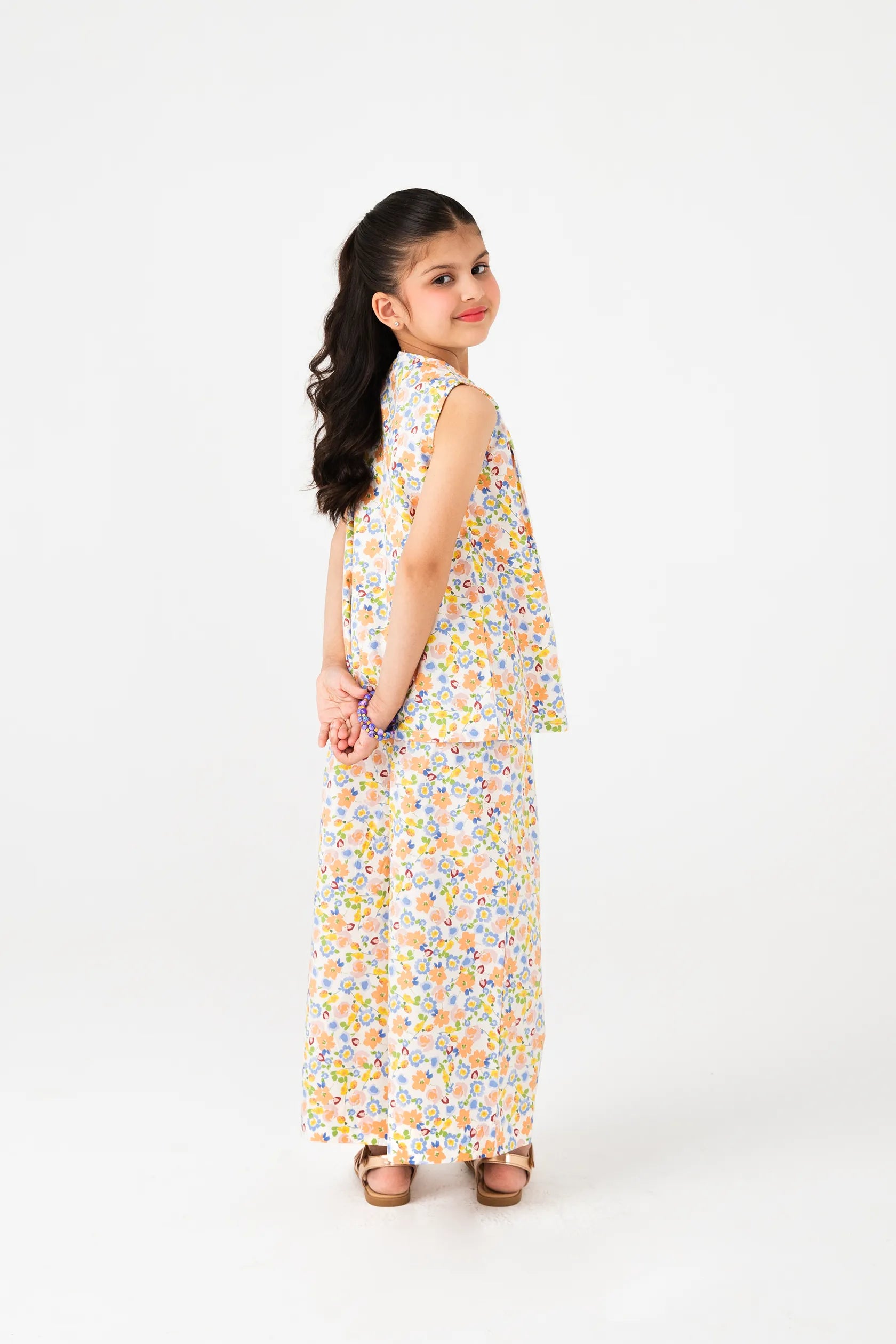 Soft cotton fabric makes this co ord set breathable and gentle for daily wear. The sleeveless top pairs perfectly with flowing wide leg trousers for a relaxed fit. A multicolor floral design adds joyful energy, making it ideal for park days, playdates, and casual family outings.