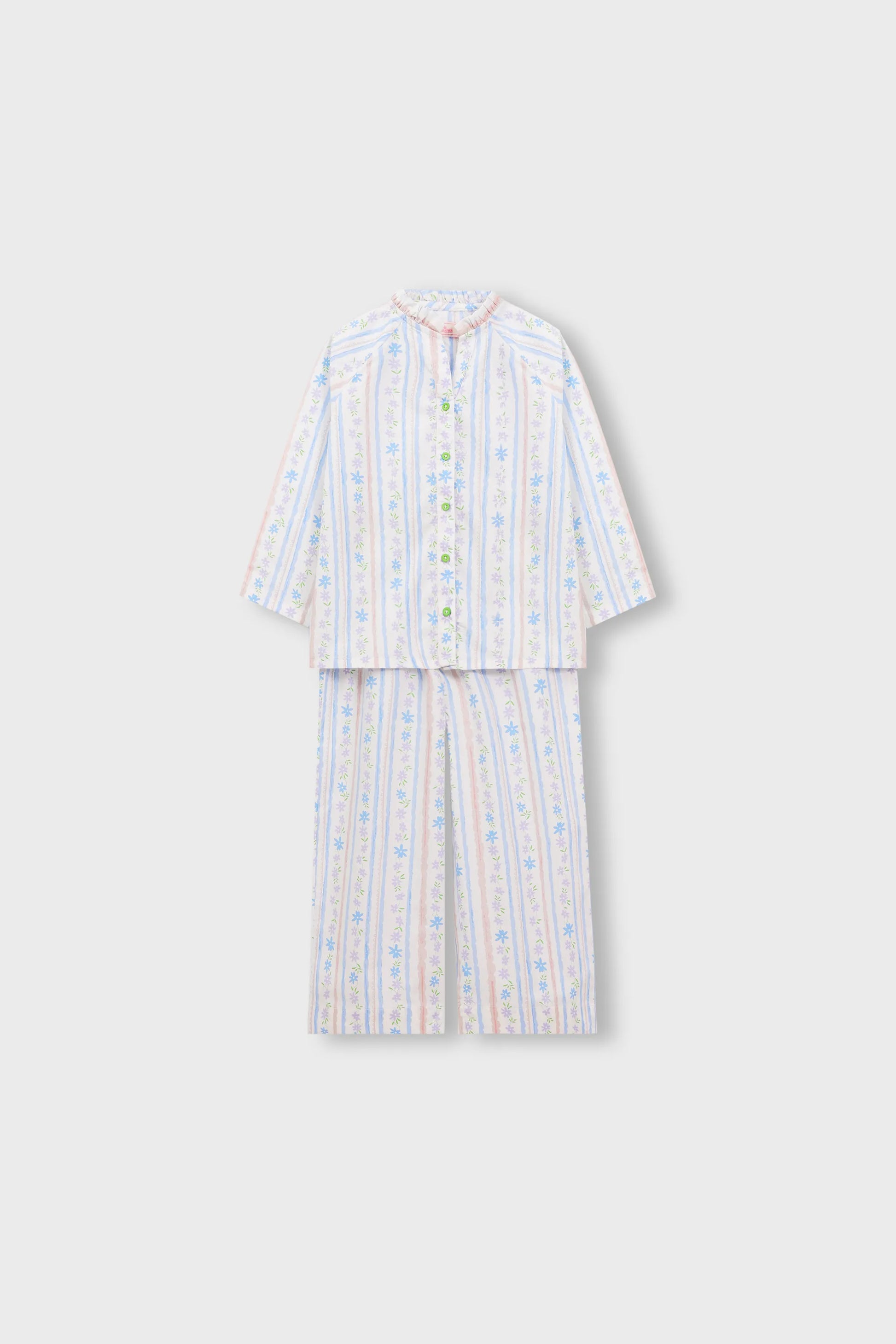 This charming two-piece set features a fun and vibrant floral print on soft cotton fabric. The top has a cute round neckline with button closures, while the wide-leg trousers ensure comfort and freedom for play. A perfect outfit for sunny days filled with fun and adventure!