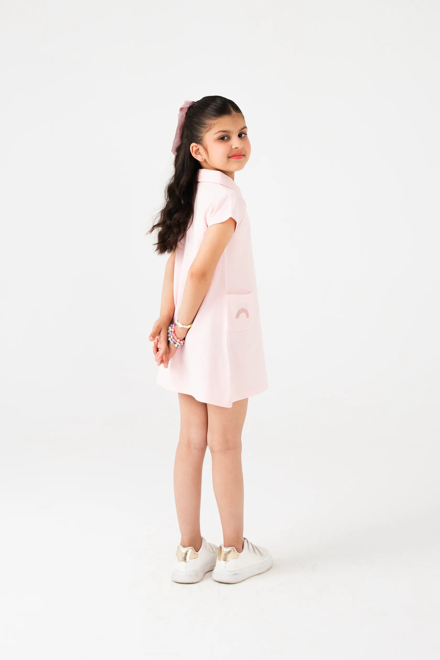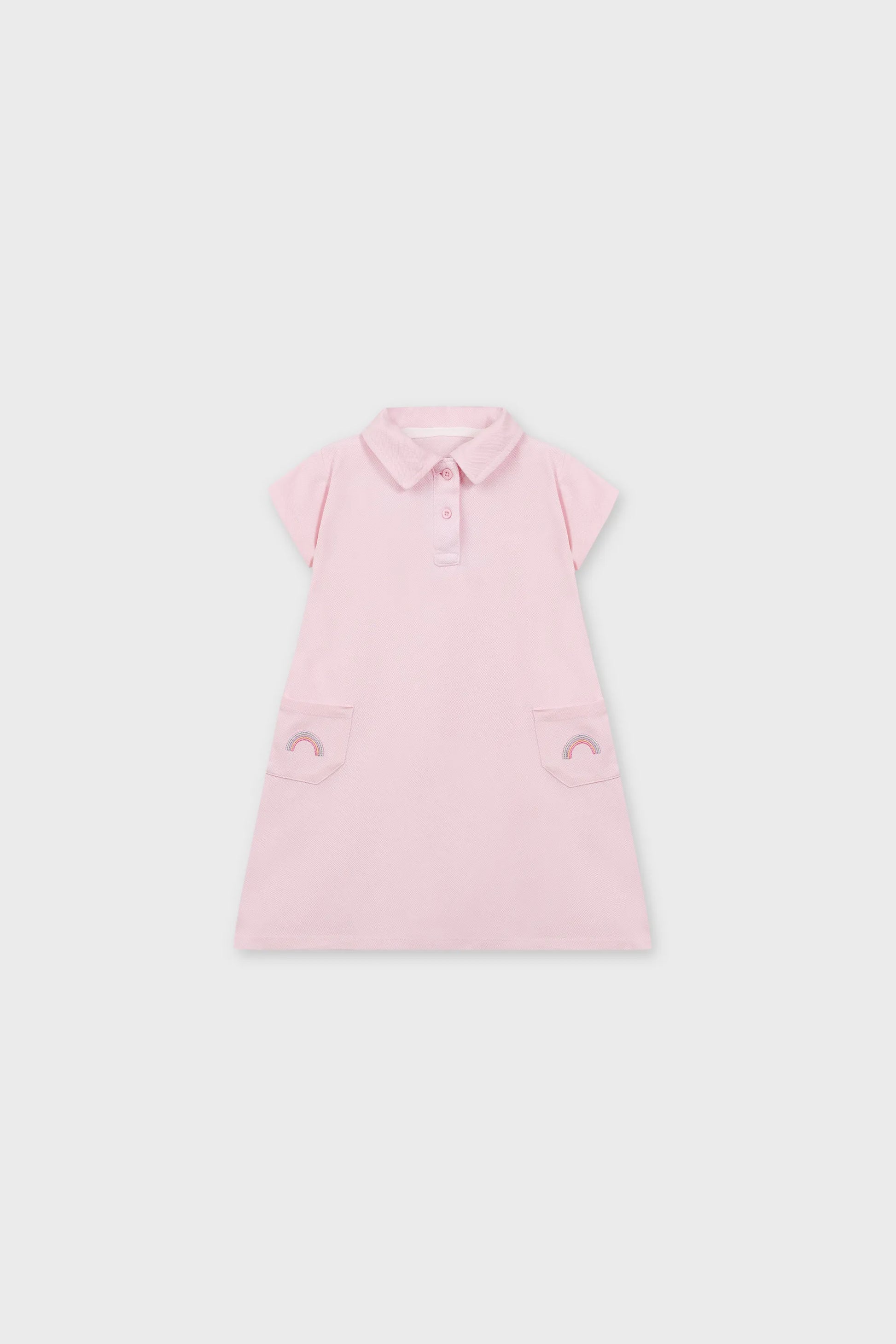 This lovely powder pink polo dress brings together sporty elegance and everyday comfort. Made from textured pique fabric, it features a polished polo collar, button placket, and short sleeves. The gentle A line silhouette falls beautifully to knee length, while front patch pockets add a cheerful practical detail.
